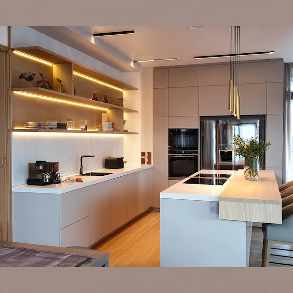 3. Dodajte rasvetu – LED trake ispod elemenata daju praktičnost i vizuelni efekat.